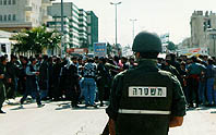 Above: An Israeli border guard surveys a Birzeit student demonstration, 1996. Photo by Yasser Darweesh. |